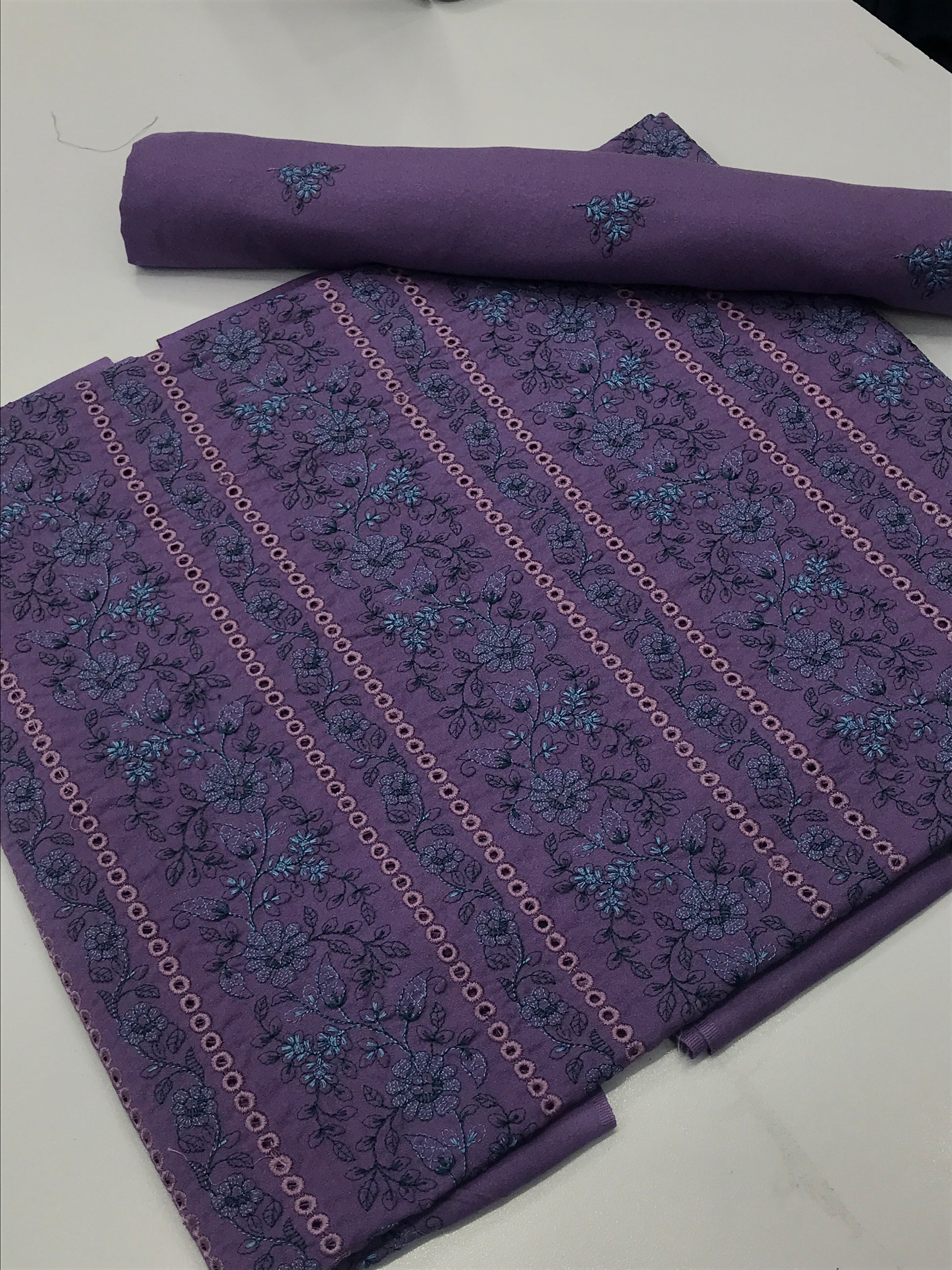 Shirt Fabric: 2.75 yard Karandi – Front full embroidered, back and sleeves with small boti design.